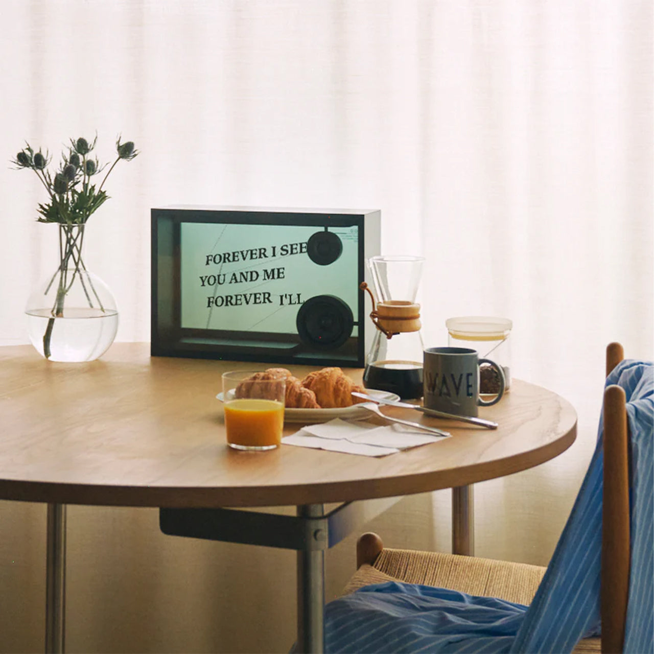 A transparent, high-fidelity display that lets your favorite lyrics come alive in real time. Crafted from premium wood and glass, it projects words that move with your music, blending minimalist design with emotional depth.